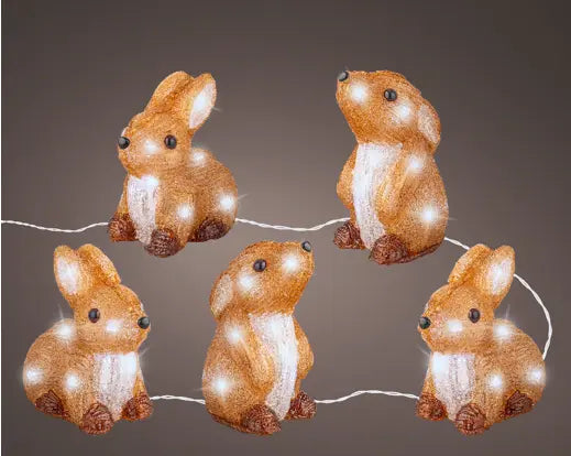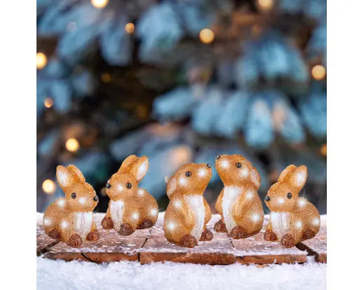 Porta un tocco di allegria e magia alle tue decorazioni natalizie con questo incantevole set di 5 conigli luminosi. Ogni scoiattolo, realizzato con dettagli curati, è illuminato da luci LED calde che creano un’atmosfera accogliente e festosa.