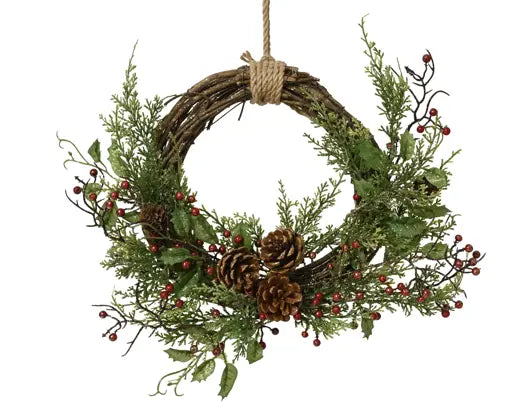 Ghirlanda effetto intrecciato con mix di foglie e bacche verdi, un dietroporta perfetto per la stagione natalizia per portare in casa tua un tocco natalizio senza dimenticare stile ed eleganza