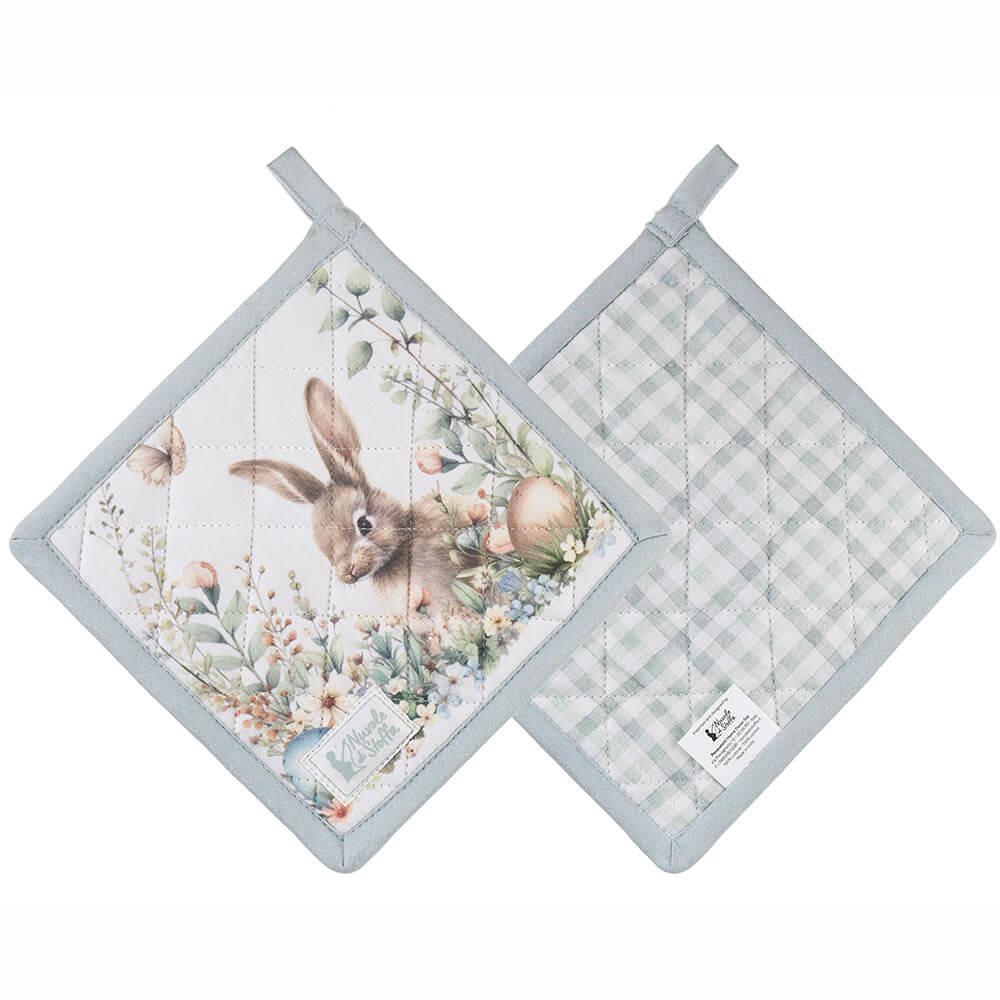 Presina double face in cotone imbottito Nuvole di Stoffa, collezione Pepen. Un lato decorato con coniglietto pasquale, fiori e uova su fondo chiaro; l’altro a quadretti verde salvia coordinati. Bordo rifinito e pratico gancio per appenderla. Funzionale e decorativa in perfetto stile shabby chic.