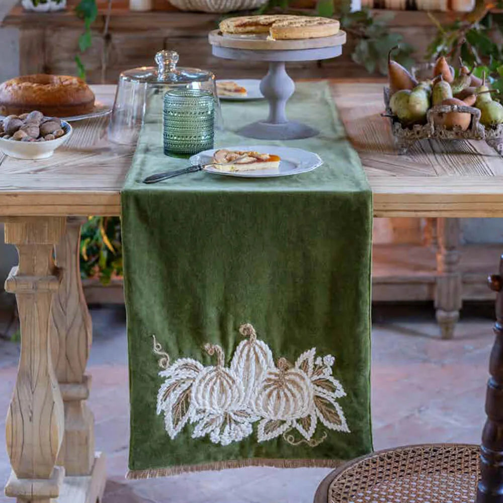 Elegante e ricercato, il runner “Zucche di Sogno” di Blanc Mariclò è pensato per vestire la tavola nei mesi autunnali con stile. Realizzato in morbido velluto 100% microfibra color verde oliva, presenta un ricamo centrale composto da tre zucche panna e foglie stilizzate, disposte in una composizione armoniosa e raffinata. Il bordo inferiore è rifinito con una delicata frangia tono su tono, che aggiunge un tocco vintage e sofisticato.