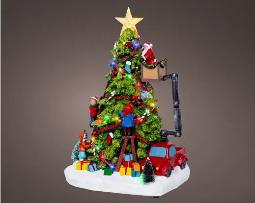 L'alberello con luci led e movimento raffigura un albero in allestimento da Babbo Natale e i suoi piccoli aiutanti, un ambientazione suggestiva che porta tutto il fascino del periodo natalizio.