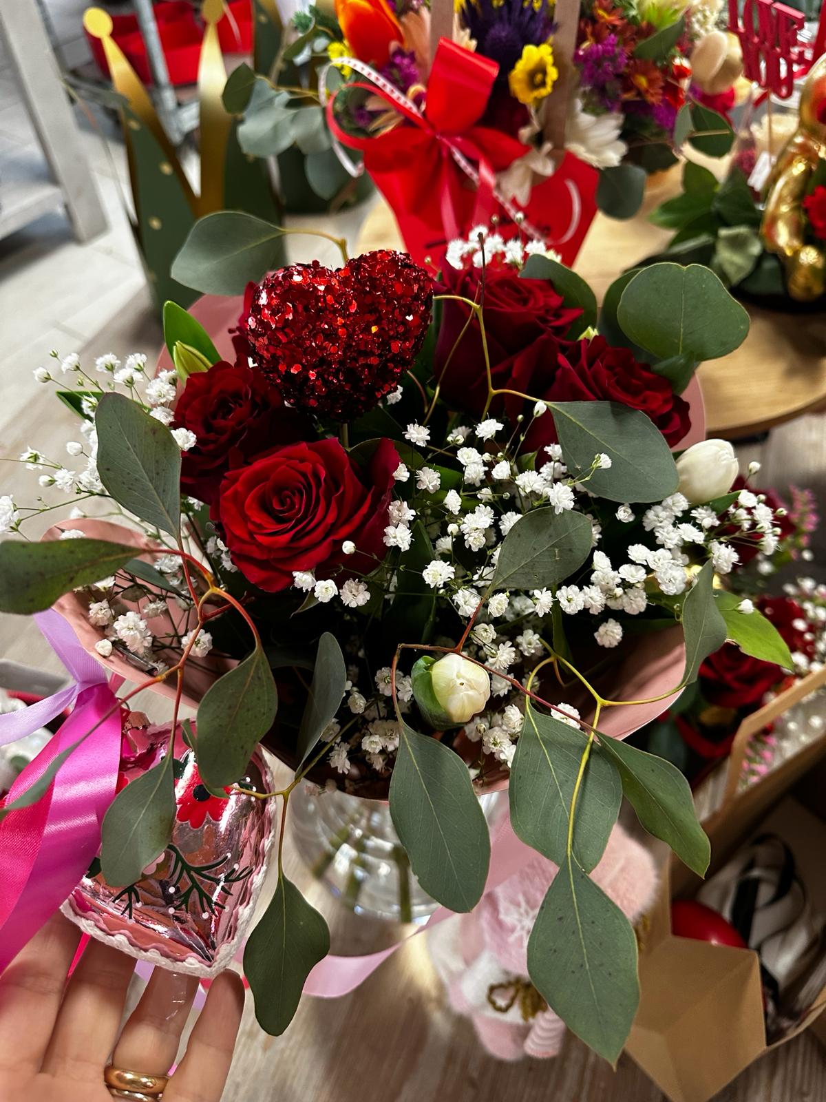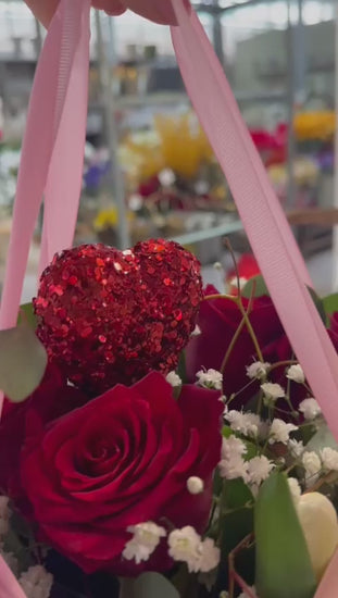 Elegante composizione realizzata in bag rosa, composta da rose rosse, tulipani e decori in strass e lucidi ad impreziosire il tutto.