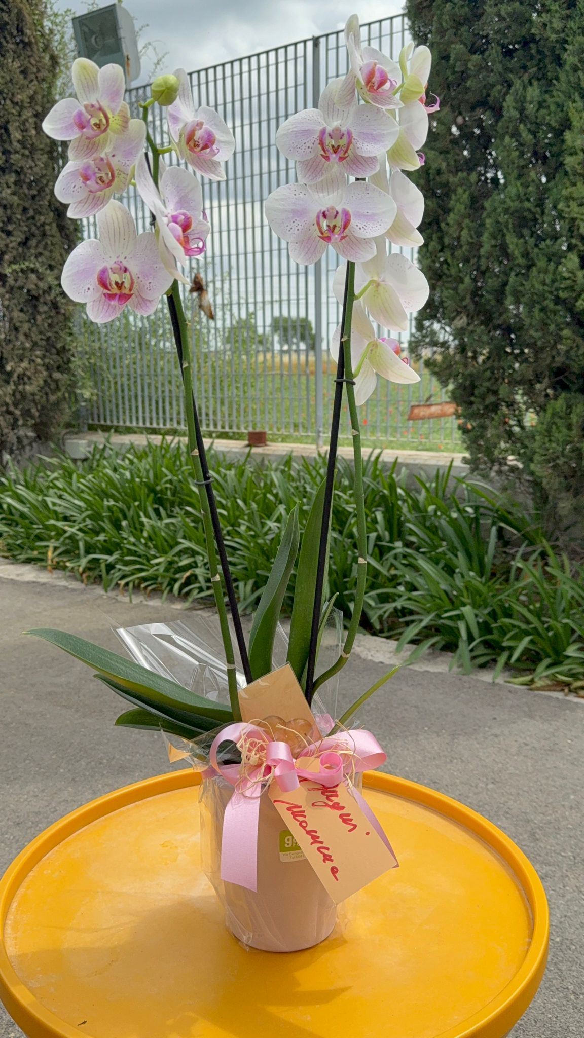 Orchidea con due rami in vaso rosa, una composizione dal gusto classico ma sempre elegante, ottima idea regalo per la festa mamma, il vaso richiama le stesse sfumature dei fiori, un fiocco sempre rosa e un bigliettino in cartoncino completano il tutto, rendendolo un dono speciale per la tua mamma