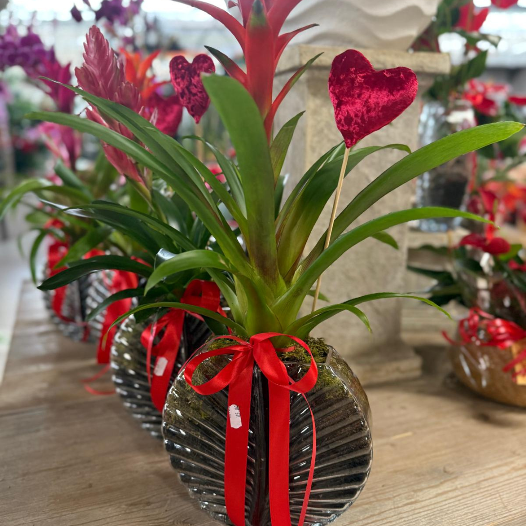 Composizione in vaso foglia con decoro cuore per mostrare tutto il tuo amore nell'occasione della festa della mamma