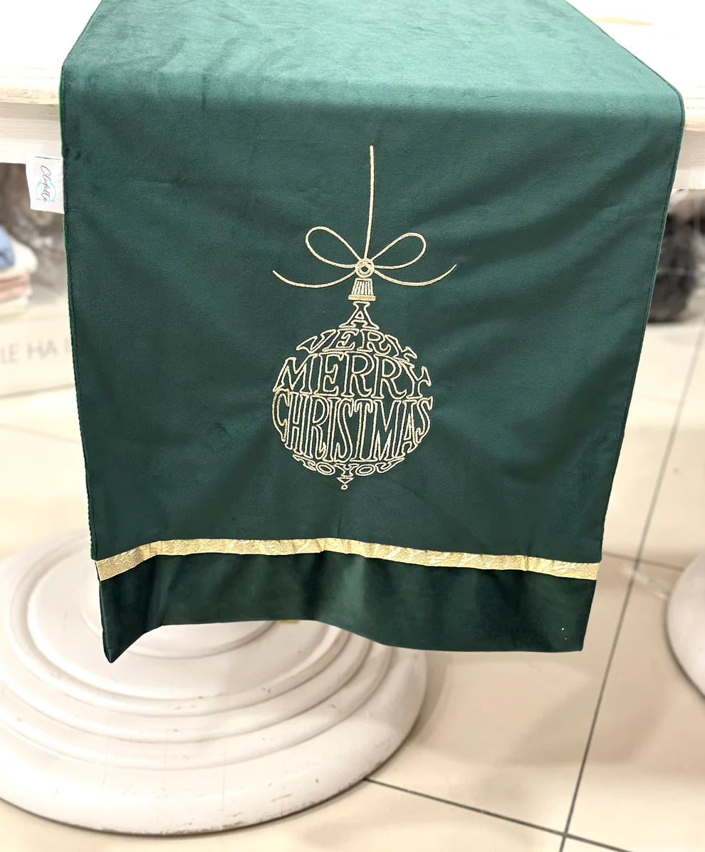 Questo runner in velluto natalizio è arricchito con un ricamo di sfera e una scritta 'Merry Christmas' con un fascione, perfetto per allestire la tua tavola o credenza durante le festività. Aggiungi un tocco di eleganza e allegria alle tue cene con questo raffinato runner. Sarà un elemento d'arredo perfetto per il tuo Natale.
