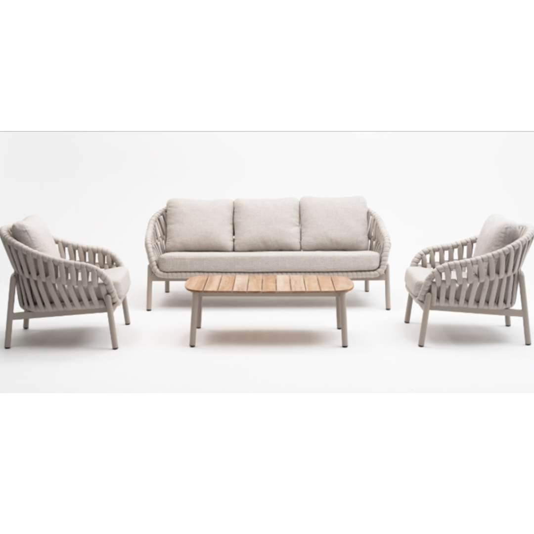 Divano cm 200x86x78H, Poltrona cm 80x86x78H, Tavolino cm 120X60X38H. Tessuto Spunpoly 180gr, piano tavolino teak, braccioli teak